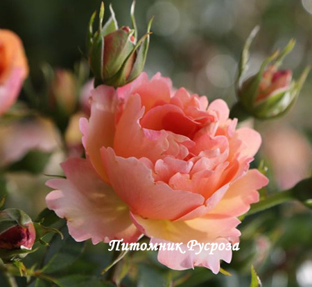 Цветок: абрикосово-оранжевый с легким розовым оттенком, чашевидный с рифленым краем лепестка, махровый, 25 - 40 лепестков в одном цветке, диаметр цветка 6 - 8 см, обладает легким миндальным ароматом с нотками аниса.
