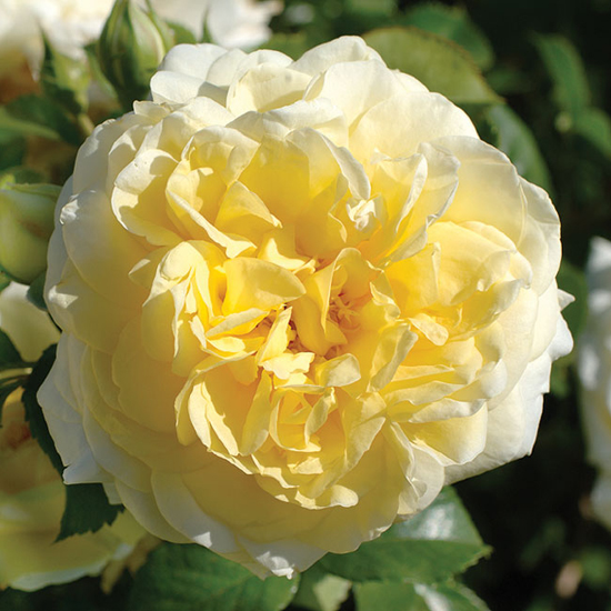 Цветок: нежно желтый с белой каймой по краю лепестка, розетковидный, густомахровый, 90 - 100 лепестков в одном цветке, диаметр цветка 10 - 12 см, обладает ароматом.
