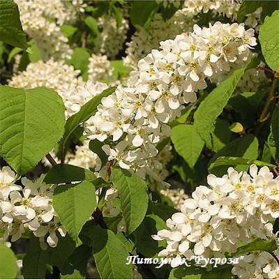 Цветки: белые, округло-овальные, рыльце пестика немного выше пыльников, чашечка широкобокальчатая, чашелистики незазубренные. Кисти длинные, 10 - 12 см.