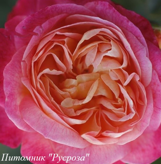 Цветок: нежно розовый с абрикосово-кремовым с кофейным оттенком центром, при полном распускании появляется зеленый глазок, а край внешнего лепестка приобретает малиновый оттенок, бархатистый, розетковидный со звездчатой формой лепестков, очень густомахровый, 100 - 150 лепестков в одном цветке, диаметр цветка 9 - 12 см, обладает очень лёгким ароматом, очень долго сохраняет форму, пригоден для срезки, устойчив к дождю.