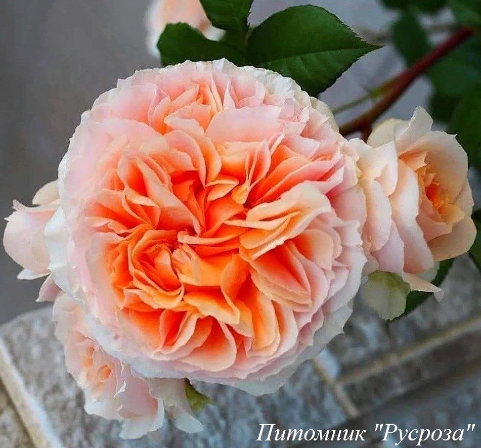 Цветок: нежно желто-абрикосовый с коралловым оттенком, оранжевым центром и кремовыми внешними лепестками, при полном распускании становится лососево-розовым с желтым оттенком, розетковидный, густомахровый, 90 - 110 лепестков в одном цветке, диаметр цветка 12 - 15 см, обладает насыщенным фруктовым ароматом.