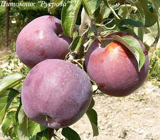Плоды: крупные (130 - 150 г), одномерные, плоскоокруглой формы, поверхность гладкая или слабо широкоребристая. Кожица гладкая, с сильным восковым налетом. Основная окраска темно-красная с бордовым оттенком. Мякоть среднезернистая, кремового цвета с розоватыми прожилками, сочная.