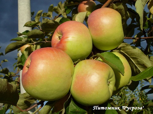 Плоды: средней величины (до 120 г), округло-конической формы, кожица гладкая, окрас плодов желтовато-зеленый, покровная окраска — буровато-красный румянец, мякоть бело-зеленоватого оттенка, мелкозернистой структуры, средней плотности, в лежке хранятся до мая.