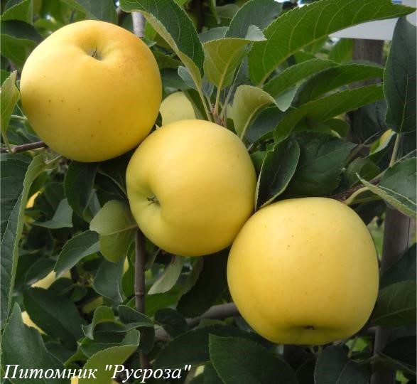 Плоды: средние (150 - 160 г), округло-грушевидные, желтые с красным полосатым размытым румянцем на большей части поверхности. Мякоть сочная, белого цвета.