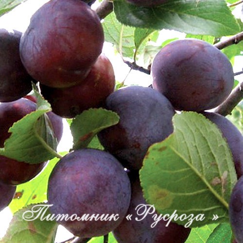 Плоды: выше среднего размера (28 – 30 г), овально-яйцевидные, красновато-фиолетовые, с густым восковым налетом и многочисленными подкожными хорошо заметными серыми точками. Брюшной шов средней глубины. Мякоть зеленовато-желтая, плотная, сочная. Косточка овальная, среднего размера, хорошо отделяется от мякоти.