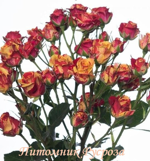 Цветок: красный с оранжево-желтыми штрихами и полосками, чашевидный, с высоким центром, махровый, 20 - 40 лепестков в одном цветке, диаметр цветка 7 - 10 см, обладает насыщенным фруктовым ароматом, долго сохраняет форму, пригоден для срезки, не выгорает.