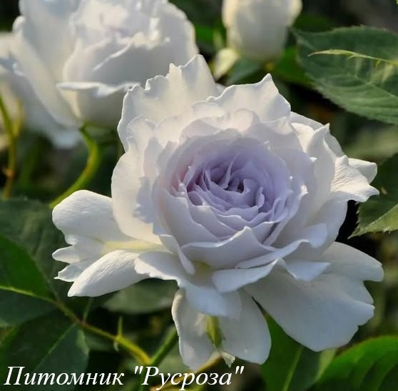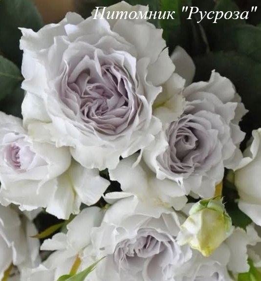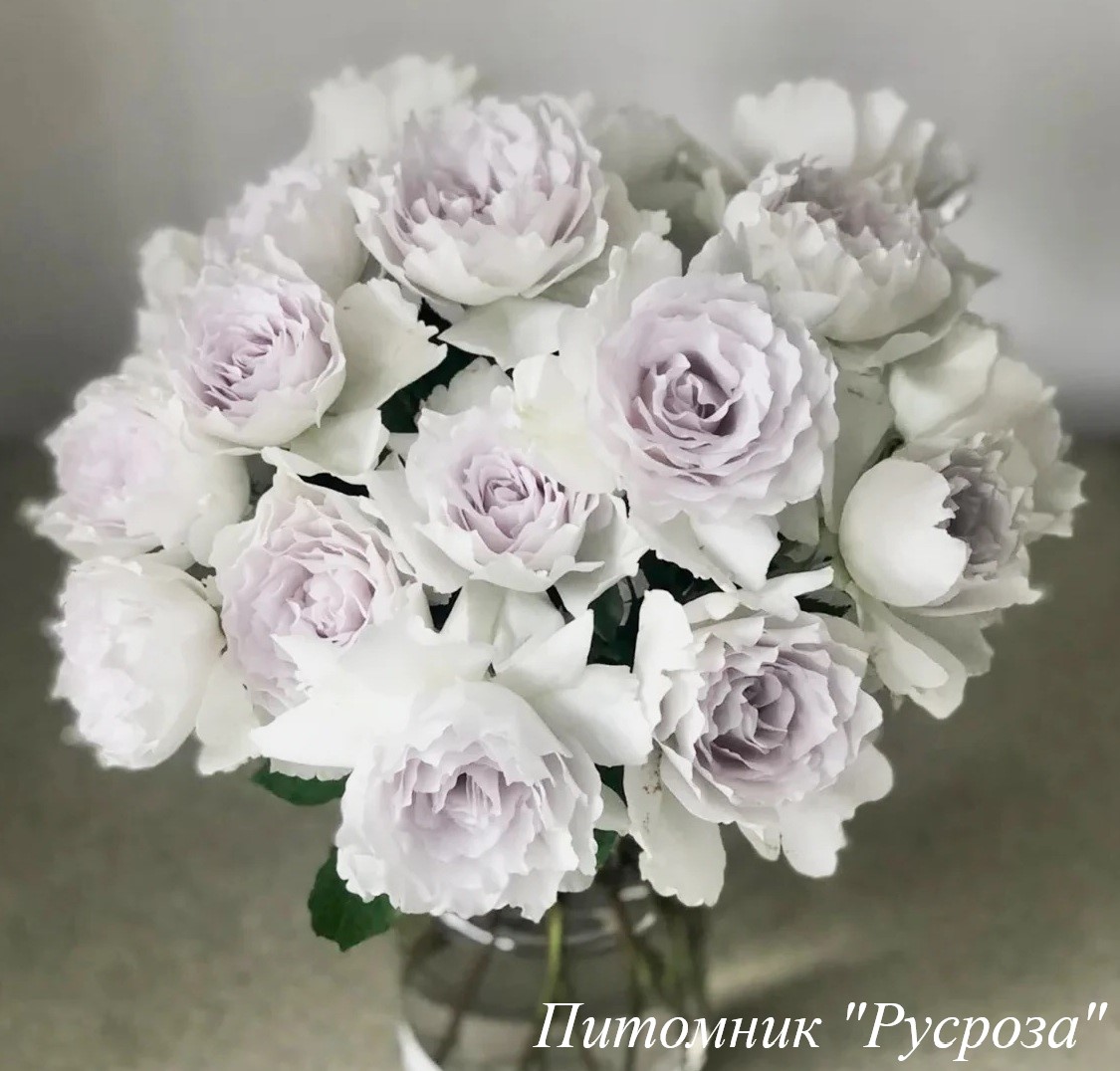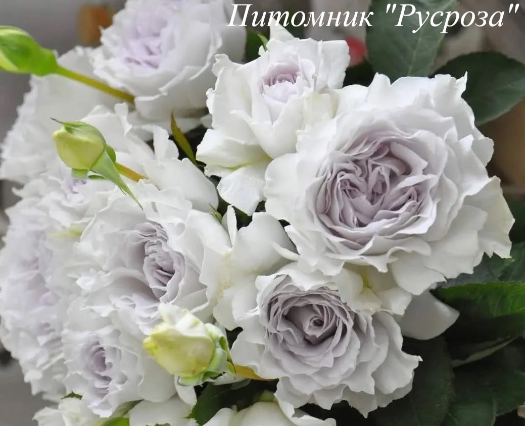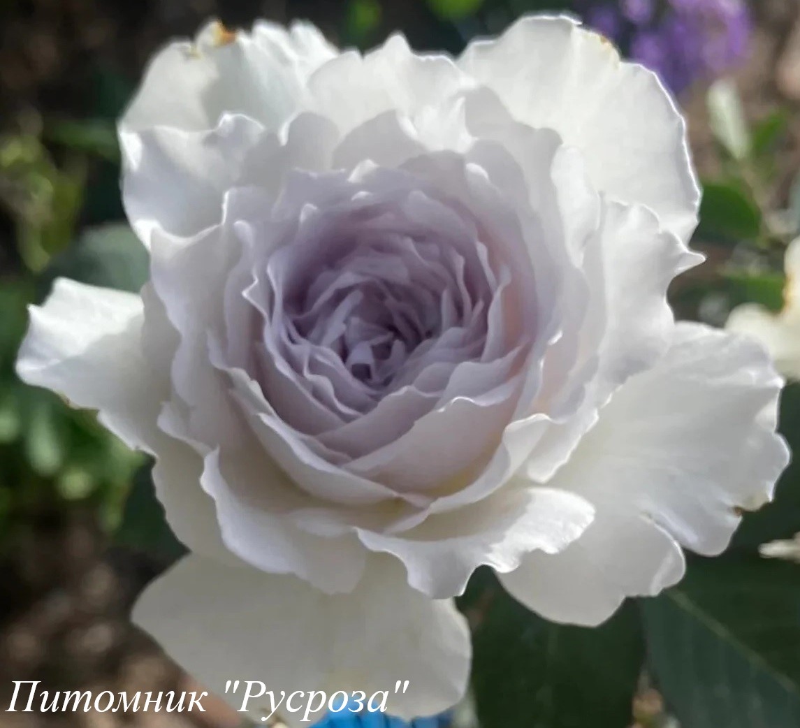Цветок: белый с сиреневым центром и серебристо-фиолетовым оттенком, шаровидный до розетковидного с гофрированным краем лепестка, густомахровый, 40 - 80 лепестков в одном цветке, диаметр цветка 6 - 8 см, обладает насыщенным фруктовым ароматом.