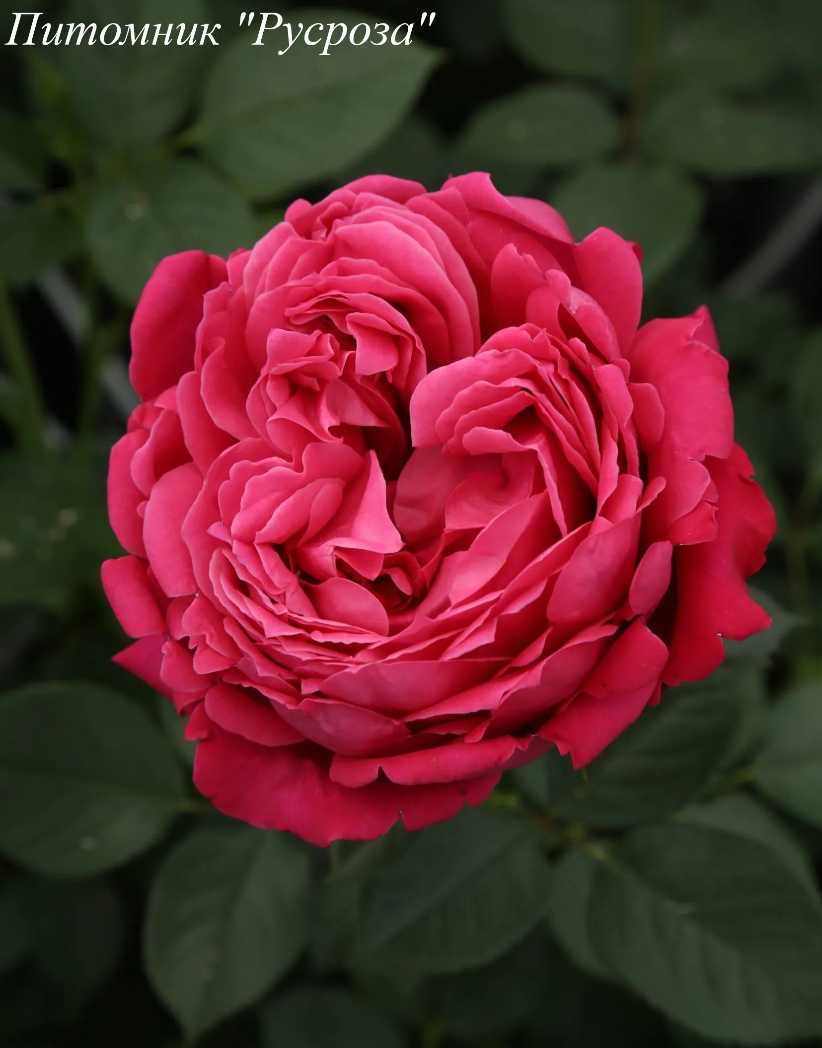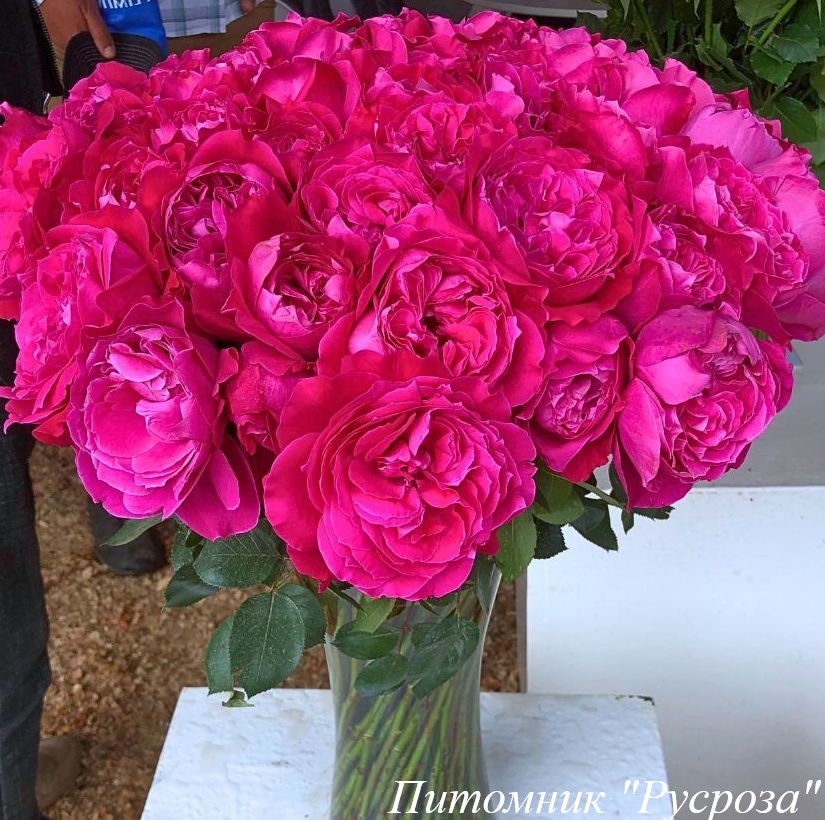 Цветок: ярко малиново-розовый до темно-красного, розетковидный, густомахровый, 60 - 80 лепестков в одном цветке, диаметр цветка 8 - 11 см, обладает очень легким ароматом, долго сохраняет форму, пригоден для срезки.