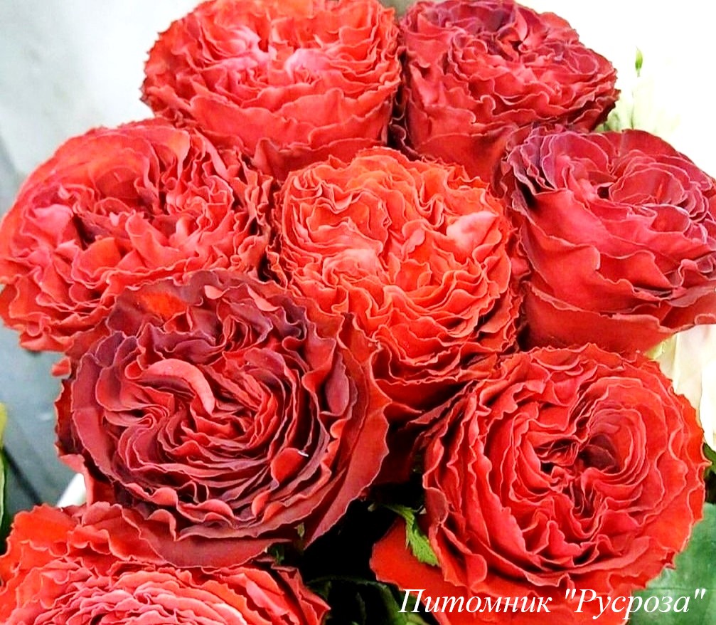 Цветок: ярко красный, при полном распускании с зеленым глазком, чашевидный до розетковидного с волнистым краем лепестка, густомахровый, 100 - 130 лепестков в одном цветке, диаметр цветка 8 - 10 см, обладает ароматом, очень долго сохраняет форму, пригоден для срезки.
