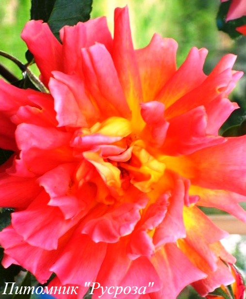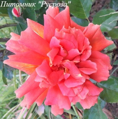 Цветок: оранжево-желтый с розово-коралловым оттенком, при полном распускании становится оранжевым, чашевидный, с высоким центром, махровый, 25 - 40 лепестков в одном цветке, диаметр цветка 8 - 10 см, обладает насыщенным ароматом.