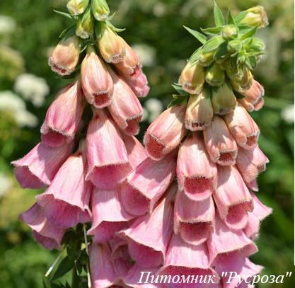 Цветение: в июне - июле, около месяца, соцветие – односторонняя кисть, густое, крупное, прямостоячее, цветки колокольчатые, со слабо-зигоморфным отгибом, 4 - 5 см длиной, розовые.