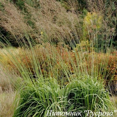 Растение: многолетний злак, высокорослое, компактное, высота 100 - 150 см. Стебли поникающие. Листья линейные, серо-зеленые или зеленые, а осенью золотисто-желтые, узкие, плотные.
